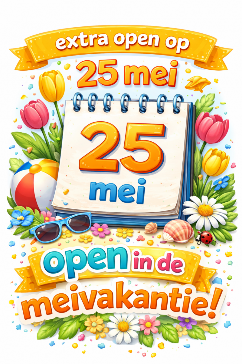 Schrijf het alvast in je agenda, we zijn extra open op zaterdag 25 april van 10.00 tot 13.00 uur. Ook in de meivakantie zijn we gewoon open tijdens de normale openingstijden.