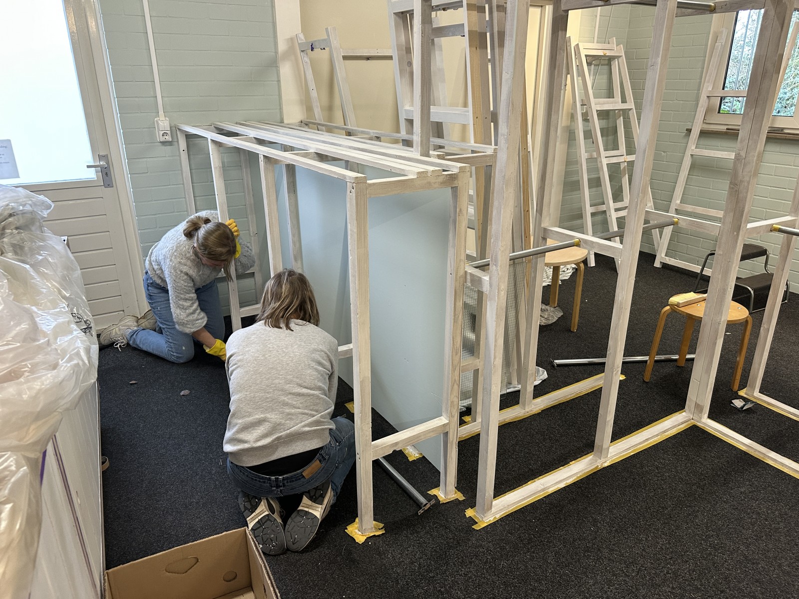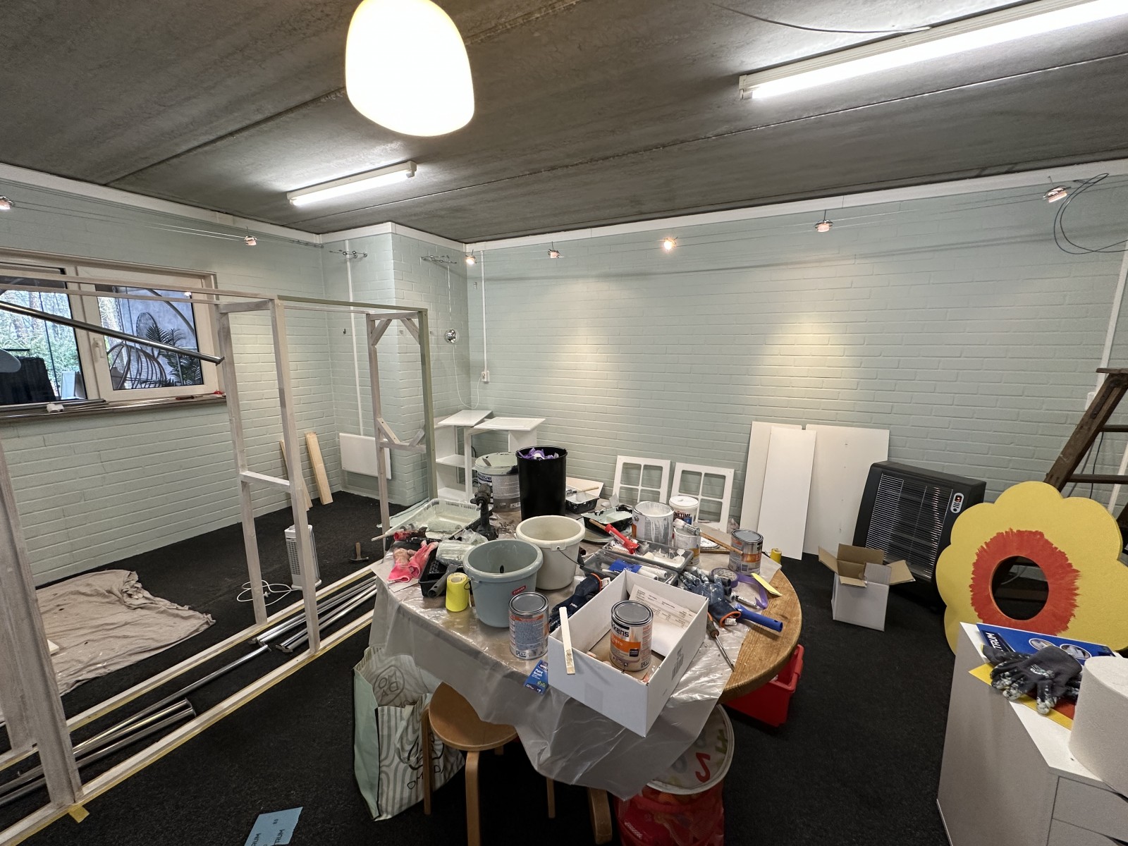 Alle kleding staat tijdelijk even ergens anders. Eigenlijk staat er bijna niets meer op zijn plek. We zijn druk aan het schuren en schilderen. Van tijd tot tijd zit alles onder het stof, maar aan het eind van de dag vinden we (meestal) tijd om te stofzuigen en de rommel een beetje op te ruimen. We worden zelf steeds enthousiaster, naarmate er steeds meer kleur in de winkel komt.