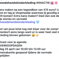 Er wordt al zomerkleding ingebracht, maar er is ook altijd plek voor jouw kleding. We nemen kleding aan vanaf baby tot tienermaten. Breng het bij de winkel of bij Marianne (06 11267147) in Agelo. Zorg dat je naam op de zak of tas staat, waarin je kleding zit en dan boeken wij jouw kleding in. Het...